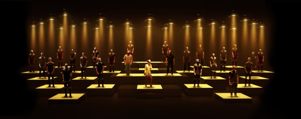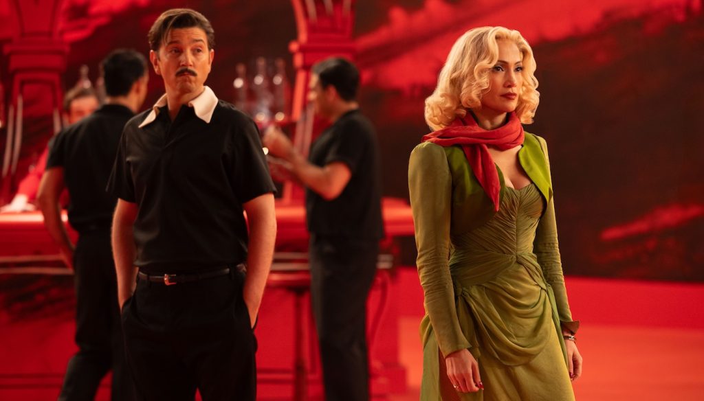 The number that references Marilyn Monroe directly is called “Gimme Love.” There’s also a bit of Gene Kelley, a bit of Syd Charisse. The set’s intentionally kind of cartoony and two-dimensional, very different from films now, which are very layered with set decoration because our science fiction big-canvas images are jam-packed with detail. It’s the opposite with these old musical movie numbers. Our sets were pared down, abstracted, theatrical, and artificial-looking, and all of that is intentional. If our 1940s musical numbers looked anything like real life, we would have failed miserably. [laughing].