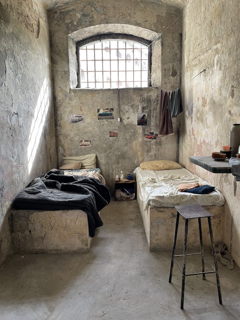 The cell itself is a stage set we built on a Montevideo soundstage. We spent almost three weeks in the cell with the two guys doing their scenes. We had a wonderful group of scenic artists and a construction crew who created all the wall textures and decay, the sliding doors, and the big gates. On the [real] location, our artists replicated what we’d done on the soundstage so the prison would look like it was all one thing.