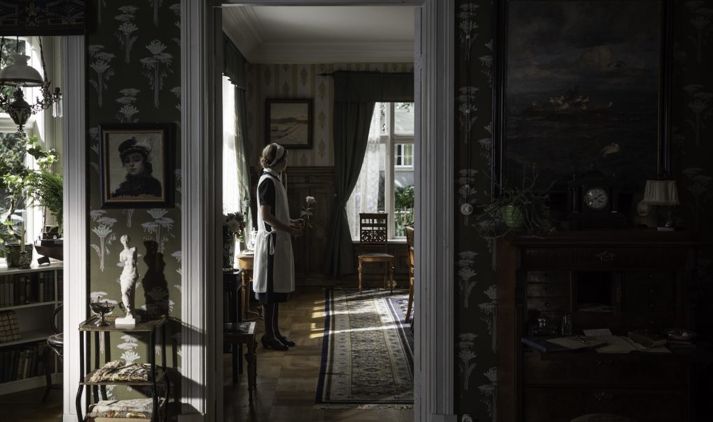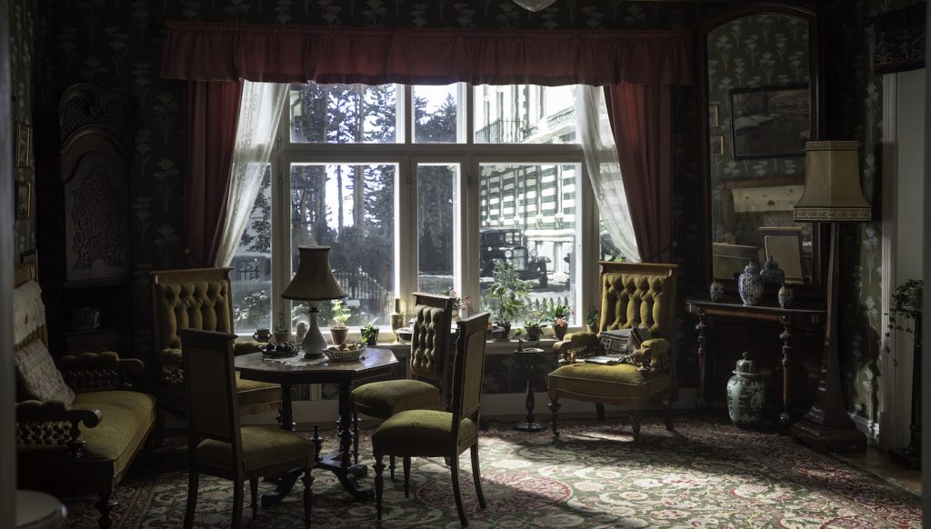 Yeah, and I brought in some furniture from the ’30s that I imagine was stored somewhere in the house, but they took it out to use again. There was more colorful art in the 1960s, when I imagined many people coming and going for parties, poetry readings, music, and dancing, maybe to run away from the sadness, but also a time of joy. We see the ’80s in three shots with Edith and her lover and housekeeper, Lillian (Julia Küster), who lived there for all those years. I wanted to show the rich and beautiful life they enjoyed together, with a lot of colors, and surround them with art and books. But when Gustav moves in, he paints everything white and tears down the wood paneling. We had these one-shots through the doorway in the years 1918, 1925, and 2000, which were like death, birth, and the argument with Nora’s parents.