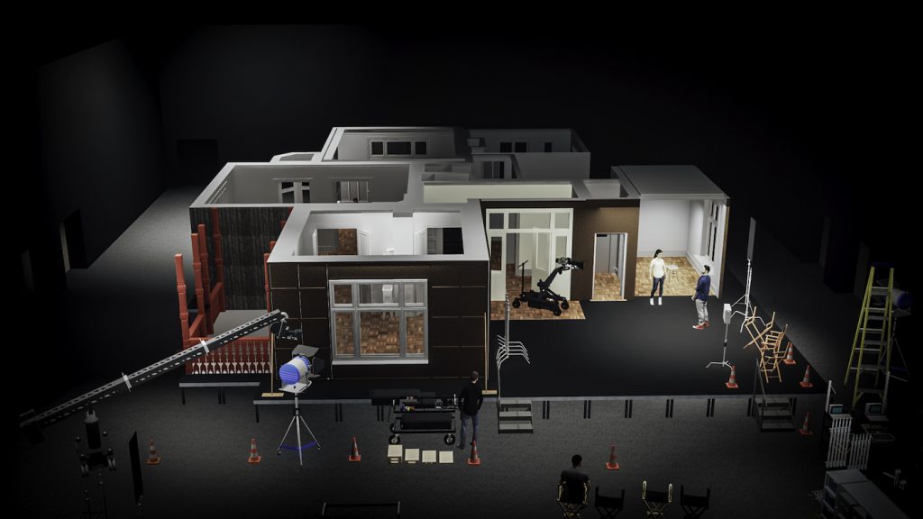 We built the first and second floors, including the bedrooms, corridor, and exterior balcony, with all the red woodwork. We had one balcony that could go on wheels between floors. It’s almost like building a real location on the soundstage because we had full ceilings in all the rooms, moldings in the ceilings, and aged wooden floors. We actually found a couple of doors that matched the house. We built the other doors and windows too, including the massive ones with double-paned glass in the living room. We had virtual production in-camera VFX with LED screens for the views outside the windows.