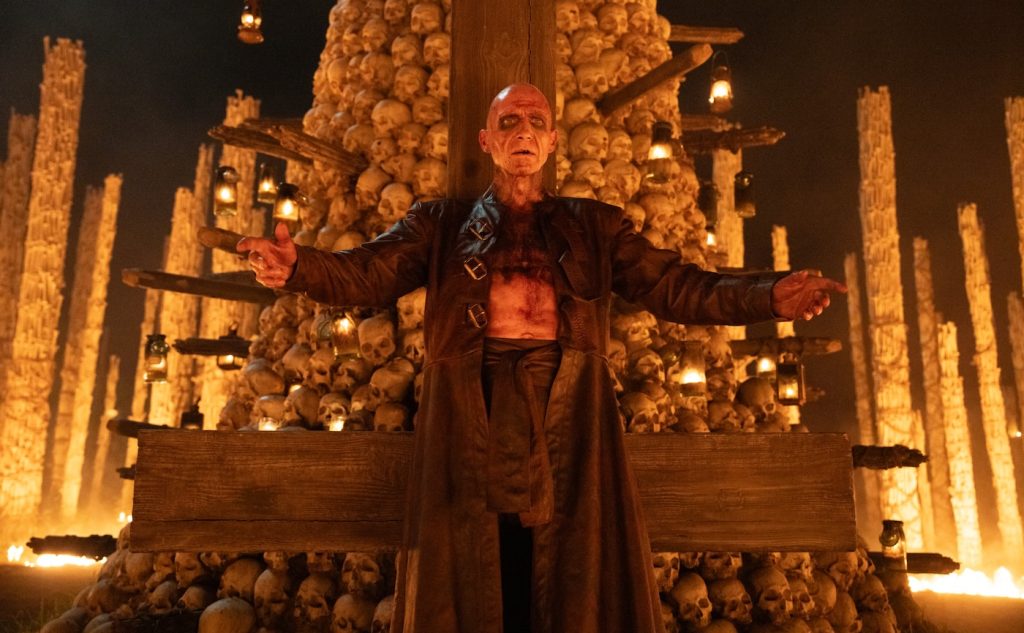 Also returning is Ian Kelson (Ralph Fiennes), the enigmatic doctor who tried to save Spike’s mother, and the Alpha (Chi Lewis-Parry), the faster, stronger (more intelligent) variation of the infected. Kelson’s relationship with the Alpha, which he names Samson, has evolved. He’s trying to find a cure, or at least alleviate some of the pain Samson experiences through sedatives. DaCosta brings viewers into the Alpha’s psyche, framing distinct close-ups revealing his emotional state. “The first time we meet Samson, we see him across a field from Kelson. He is in his sort of full Alpha berserker look at that point. And then, as the film progresses, and he gets more humanized, his wounds start to heal. He’s looking more and more naturalistic,” says the VFX supervisor. “They had four stages to him with multiple contacts and makeup to show that transition that was combined with effects work. There was also more work pushing Kelson to be a bit more vibrant, and that sort of iodine, Satan look. So, in that first scene between them, there’s that contrast. Then, as we go, their skin tones start to resemble each other.”