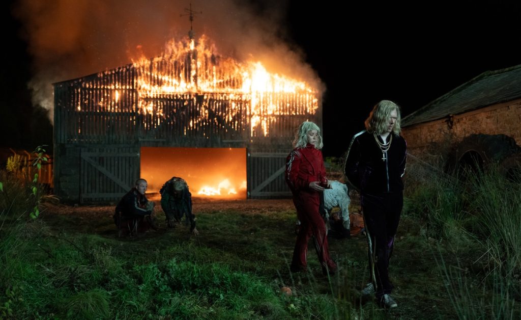 One scene involves Spike’s initiation into Jimmy’s cult, a group of blonde-wigged, tracksuit-wearing blokes all named Jimmy. Spike is made to fight another member to the death, or be killed if he refuses. Shot at an abandoned leisure center, the visual effects were designed to be invisible. “Because of the confined space, there’s a lot of circling and spiraling to the camera work around the action and the actors. So we just allowed those performances to play out to not disrupt the actors,” Koonjul notes. Special effects designed a rig that squirted blood for its climactic moment, which visual effects embellished in post.