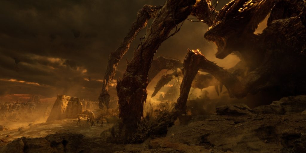 “We went out to a quarry in Georgia and we set up a giant blue screen and then we sculpted all of the foreground rock elements based on what we liked about that place in New Mexico,” says Trujillo. “Anything you see kind of immediately around the characters in the foreground, those are all sculpted elements. Then we ended up creating [vfx] plates based on the [New Mexico] location and those ended up being the physical, vista view that’s around the characters in the distance.”