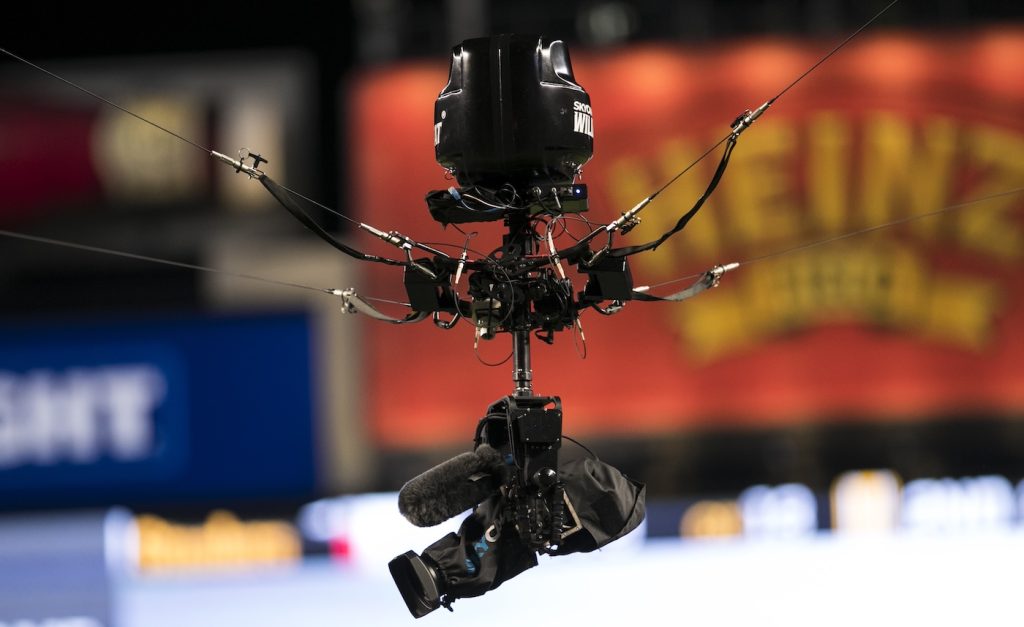 SkyCam has eight riggers. It’s mounted at four corners of the stadium, so they have to install a pulley system, rig the camera, and set up the cables, which are smart in that they generate data. Then there’s a pilot who actually flies the camera, an operator who’s got two joysticks to operate it, and a couple of technicians.