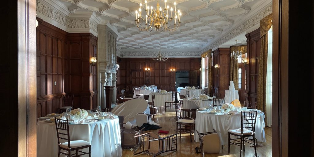 But securing the venue was only the beginning. As a functioning event space booked months, sometimes years, in advance, it required constant negotiation and scheduling acrobatics. “We had to move in and out of there like three times,” she says. “Over about two weeks.” Each move meant dismantling and reconstructing elaborate set dressings, particularly challenging when it came to florals, which had to remain fresh across multiple shooting windows. “It was a heavy lift for all departments,” Mackenzie admits. “But I feel like… everyone was willing to maybe take that extra step to make it work.”